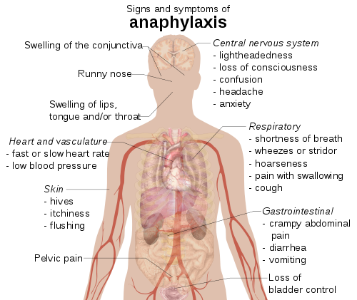 Any severe acute allergic reaction also has the potential to be life threatening, causing anaphylaxis, a reaction spread throughout the entire body that can start with agitation, a 'feeling of impending doom' pale skin (due to low blood pressure), and/or loss of consciousness (fainting). Anaphylaxis can be fatal without the rapid administration of an adrenaline injection.