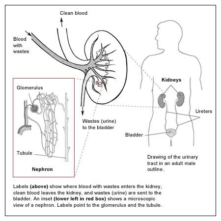 Plasma, the liquid portion of blood, contains many different proteins. One of the many functions of the kidneys is to retain plasma protein so that it is not excreted along with waste products when urine is produced. There are two mechanisms that normally prevent protein from passing into urine: (1) the glomeruli in the kidney provide a barrier that keeps most larger plasma proteins inside the blood vessels but allows water and small proteins to be filtered out and (2) the small proteins that do get through are almost entirely reabsorbed by the tubule.